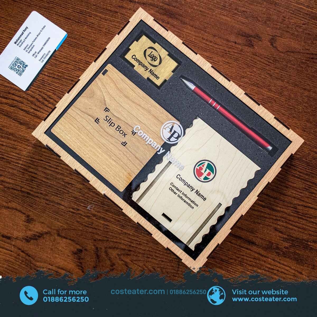 Elevate your desk with the Costeater Wooden Desk Ensemble, a versatile and stylish set featuring a Card Holder, Pen Holder, Paper Weight, and a sophisticated China Metal Pen. Crafted with precision from premium 3mm Laminated Board, each item complements your workspace, and the complete set comes in a full box with a 2mm board, 2mm acrylic, and metal body details.